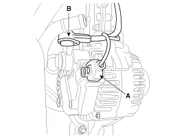 Desconecte el conector del alternador (A) y suelte el cable (B) del terminal del alternador "B".