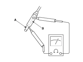 Comprueba si hay continuidad entre el polo central (A) y el polo exterior (B) del cable de la antena. No debe existir continuidad.