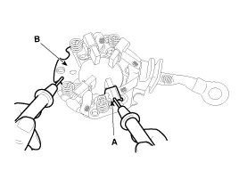 Asegúrese de que no haya continuidad entre el portaescobillas (+) (A) y la placa (-) (B). Si hay continuidad, cambie el conjunto del portaescobillas.