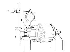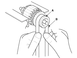 Compruebe la superficie del conmutador (A). Si la superficie está sucia o quemada, rectifíquela con papel de esmeril o en un torno según las especificaciones, o repárela con papel de lija del número 500 o 600 (B).