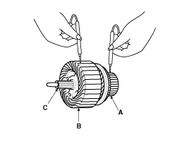 Compruebe con un ohmniómetro que no existe continuidad entre el interruptor (A) y el nucleo de la bobina de armadura (B), y entre el interruptor y el eje de la armadura(C). Si hay continuidad, sustituya la armadura.