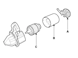 Desmonte el conjunto del portaescobillas (A), horquilla (B) y armadura (C).