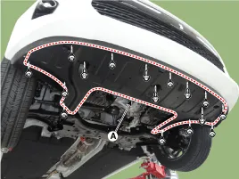 Desmonte la cubierta inferior del compartimento del motor (A) tras aflojar los pernos y las tuercas de fijación.