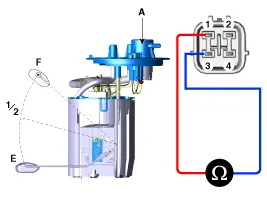 Con un ohmimetro, mida la resistencia entre los terminales 1 y 3 del conector del aforador (A) en cada nivel de flotación.
