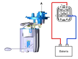 Compruebe el funcionamiento del motor connectando el conector de la bomba de combustible (A) al suministro (n°4) y a masa (n°5).