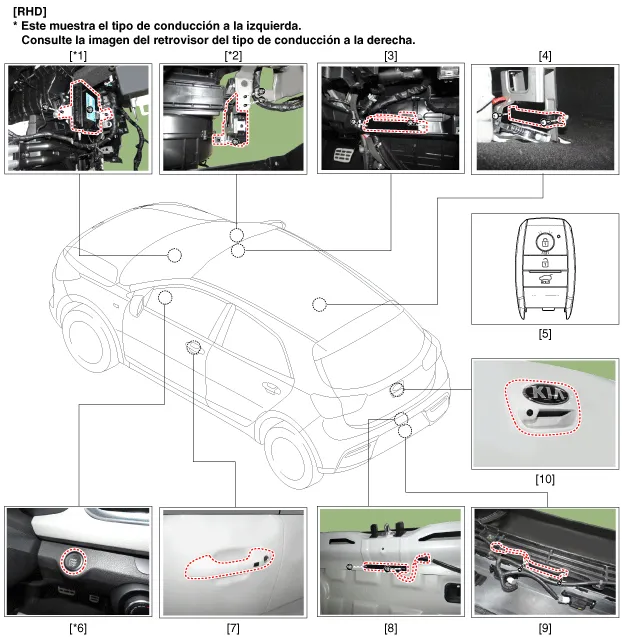 (SSB) 7. Antena de la puerta y manilla de la puerta 8. Antena del portón trasero 9. Antena del parachoques 10. Interruptor de apertura del portón trasero |