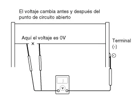 Para comprobar los posibles circuitos abiertos, mueva lentamente el hilo de prueba hacia la sección en la que se supone un circuito abierto. Busque el punto en el cual el voltaje sea 0V. El punto en el que cambia el voltaje es el punto de circuito abierto.