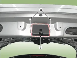 Desconecte el conector del cierre del portón trasero (A) y después desmonte el cierre del portón trasero (B) tras aflojar los pernos de montaje.