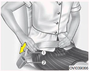 Para abrocharse el cinturón de seguridad: Para abrocharse el cinturón de seguridad, tire para sacarlo del retractor e introduzca la lengüeta metálica (1) en la hebilla (2).