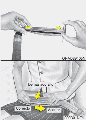 Con los cinturones estáticos de 2 puntos de anclaje hay que ajustar la longitud manualmente para que se ciña al cuerpo. Enganche el cinturón y tire del extremo libre para apretarlo. Coloque el cinturón tan bajo sobre las caderas como pueda, no en la cintura. Si el cinturón está demasiado alto, aumenta la probabilidad de sufrir lesiones en caso de accidente.