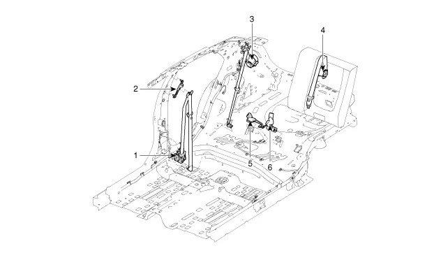 seguridad del asiento trasero [central] 5. Hebilla del cinturón del asiento trasero [RH y central] 6. Hebilla del cinturón del asiento trasero [IZQ] |