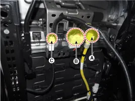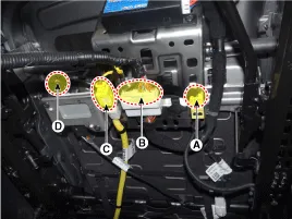 Desconecte el conector del airbag (A), el conector del interruptor del asiento eléctrico y calefactor del asiento (B), el conector de la hebilla del cinturón de seguridad delantero (C) y el conector de la unidad del calefactor del asiento (D). [del conductor]