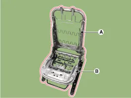Afloje los pernos de montaje y desconecte el conjunto del bastidor del respaldo del asiento delantero (A) y el conjunto del bastidor del cojín del asiento delantero (B).