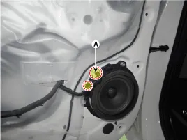 Desconecte el conector del altavoz de la puerta delantera (A) y después extraiga los clips de montaje del cableado.