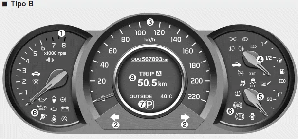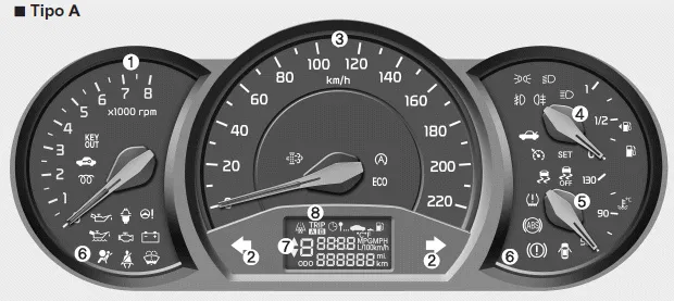 ❇ El tablero real del vehículo podría diferir de la imagen. Para más información, véase "Indicadores" en las páginas siguientes.