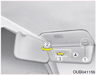 Para usar un parasol en una ventanilla, tire de él hacia abajo, despréndalo del soporte (1) y gírelo hacia el costado (2). Para utilizar el espejo, tire del visor hacia abajo y deslice la cubierta del espejo (3). La ranura (4) sirve para colocar los tiques de peaje. (opcional)