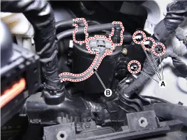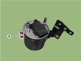 Desmonte el conjunto del filtro de combustible del soporte después de desmontar los pernos del soporte (A), cámbielo por uno nuevo y después monte el conjunto del filtro de combustible en orden inverso a los pasos anteriores.