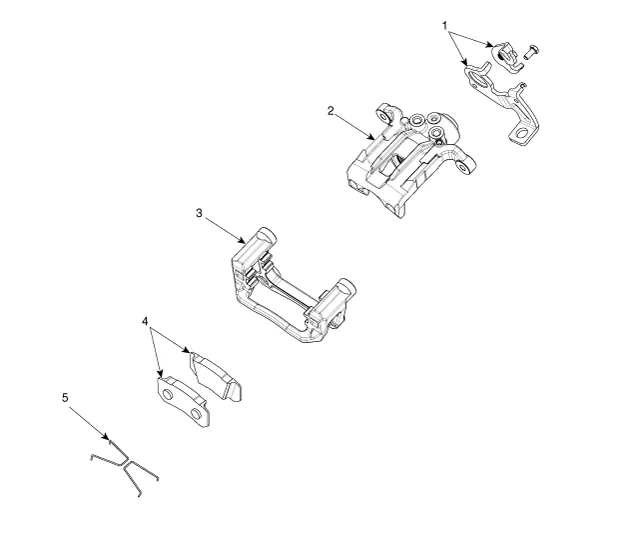 Componentes y localización de los componentes Componentes 1. Cuerpo de la pinza 2. Banco de la pinza 3. Conjunto de pastillas del freno [IN] 4.