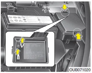 1.Desconecte la llave de contacto y todos los demás interruptores. 2.Retire la tapa de la caja de fusibles presionando el pestillo y tirando hacia arriba.