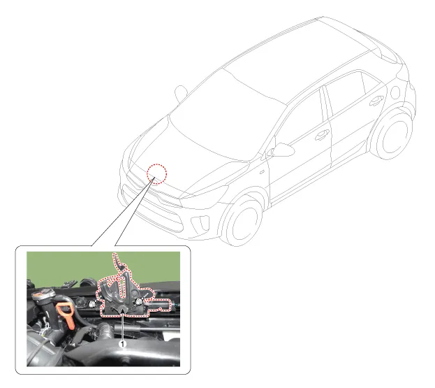 Componentes y localización de los componentes LOCALIZACIÓN DE LOS COMPONENTES 1. Manilla de liberación del pestillo del capó Procedimientos de reparación Sustitución • Póngase guantes para proteger sus manos • Use una herramienta de plástico para desmontar paneles y desmonte las piezas del guarnecido interior sin dañar la superficie • Tenga cuidado de no doblar ni arañar el guarnecido y los paneles.