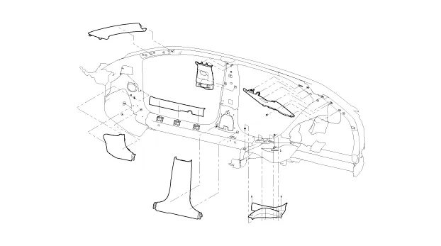 del panel inferior del parabrisas 6. Conjunto del guarnecido inferior de la columna central 7. Conjunto del guarnecido protector de la puerta trasera |