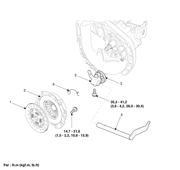 Monte el conjunto de la transmisión. D 1,4 U2 TCI (Consulte "Sistema de la transmisión manual : Transmisión manual") G 1,0 T-GDI (Consulte "Sistema de la transmisión manual : Transmisión manual") G 1.4 MPI (Consulte el sistema de transmisión manual - "Transmisión manual") |