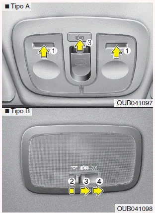 PRECAUCIÓN No utilice durante mucho tiempo las luces interiores si el motor no está en marcha. La batería se podría descargar. ADVERTENCIA No use las luces interiores al conducir en la oscuridad.