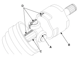 Realice marcas de alineación (D) en el conjunto del rodillo de la cruceta (A), la carcasa TJ (B) y la ranura del eje (C) para ayudar al montaje.