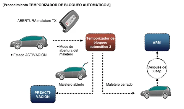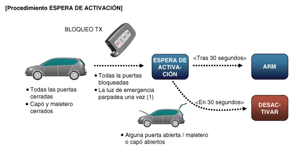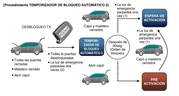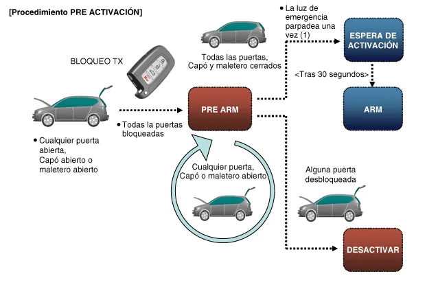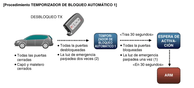 el TEMPORIZADOR DE BLOQUEO AUTOMÁTICO 2 y cerrar todas las puertas. 1-2. Si el conductor cierra el capó o el portón trasero, las luces de emergencia parpadean una vez y el vehículo activa automáticamente el modo "ACTIVACIÓN" mediante el modo ESPERA DE ACTIVACIÓN. 2-1. Si se pulsa el botón de BLOQUEO con al menos una puerta, el capó o el portón trasero abierto, el modo "PRE ACTIVACIÓN" se activa. 2-2. Dado que se emite la señal de bloqueo de todas las puertas pero no se cumplen las condiciones para "ESPERA DE ACTIVACIÓN", el vehículo permanece en modo standby y activa el modo ACTIVACIÓN mediante el modo ESPERA DE ACTIVACIÓN en cuanto la puerta que está abierta se cierra. 2-3. Si se detecta una intrusión en el modo PRE ACTIVACIÓN, el vehículo conmuta al modo DESACTIVACIÓN. 2-4. El indicador de seguridad sigue parpadeando en el modo PRE ACTIVACIÓN. |