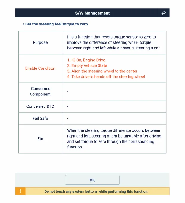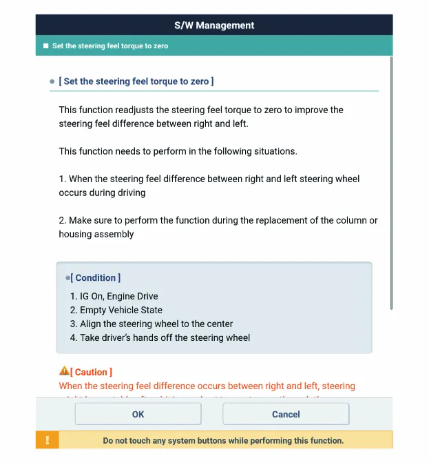 Seleccione "Ajuste el par de la sensación de dirección a cero" en la pantalla del KDS, después seleccione "OK". |
