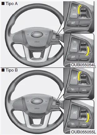 3.Suba la palanca (a RES+) o bájela (a SET-) y suéltela en la velocidad deseada. Suba la palanca (a RES+) o bájela (a SET-) y sujétela. La velocidad aumentará o disminuirá a intervalos de 5 km/h.