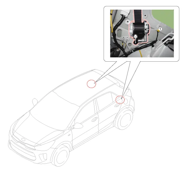 Componentes y localización de los componentes LOCALIZACIÓN DE LOS COMPONENTES 1. Retractor del cinturón de seguridad trasero central Procedimientos de reparación Sustitución Cuando monte el cinturón de seguridad, tenga cuidado de no dañar el retractor.