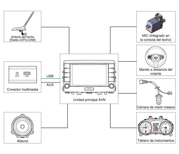 de voz y navegación, amplificador de música y la unidad multimedia que se conecta