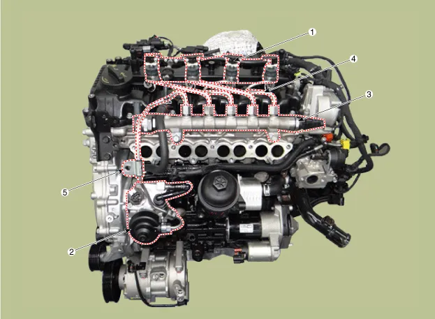 | 1. Inyector 2. Bomba de combustible alta presión 3. Common raíl 4. Tubo de combustible de alta presión (Inyector → Common Raíl) |