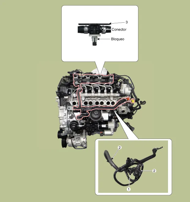 de alimentación de combustible [Baja potencia] 2. Línea de retorno de combustible [Baja potencia] 3. Conector de la línea de retorno |