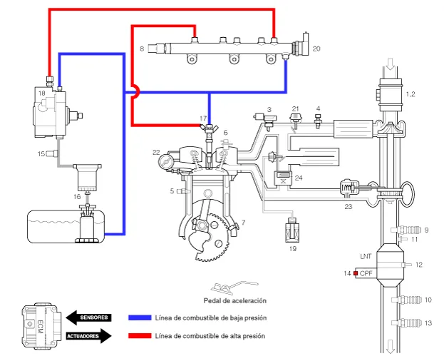 13. Sensor PM 14. Sensor de Presión de Diferencial DPF (DPS) 15. Sensor de temperatura del combustible (FTS) 16. Sensor de agua 17. Inyector 18. Válvula de control de presión de combustible (FPCV) 19. Válvula solenoide de derivación del refrigerador EGR 20. Válvula del regulador de presión del raíl (RPRV) 21. Válvula de Control de Aire (ACV) 22. Actuador de Turbulencia Variable (VSA) 23. Válvula solenoide de control WGT 24. Válvula de control EGR eléctrica (VSA) |