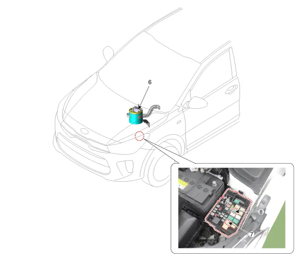 presión (Common Raíl → Bomba de combustible de alta presión) 6. Filtro del combustible 7. Relé del calefactor de combustible 8. Relé de la bomba de combustible |