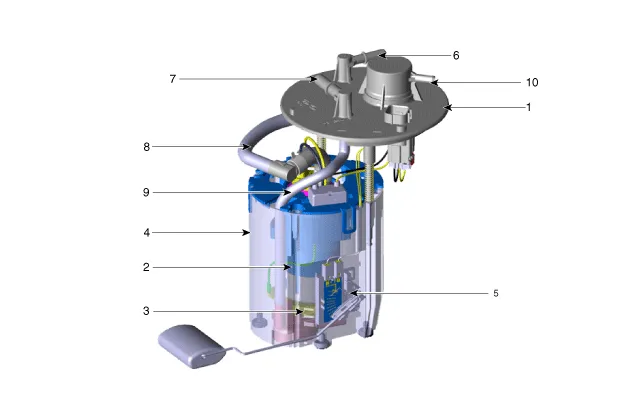 | 1. Conjunto de la culata 2. Motor de la bomba de combustible 3. Prefiltro 4) Cubeta de la reserva 5. Emisor de combustible |