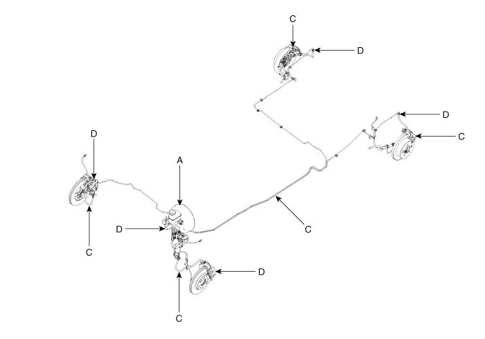 Afloje el tornillo de purga del freno trasero derecho (A) para permitir que salga aire del sistema. Posteriormente apriete el tornillo de purga firmemente. Delantero