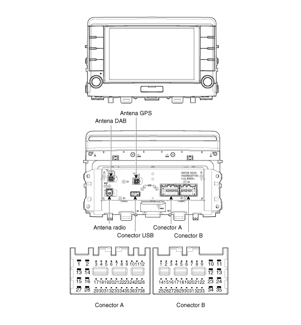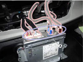 Desmonte la unidad principal AVN tras desconectar los conectores y el cable de la antena (A).