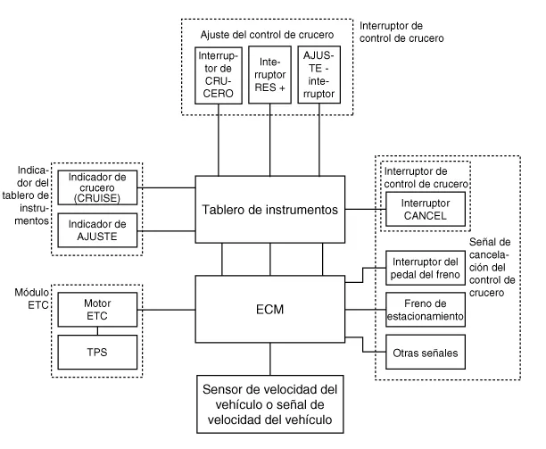 El ECM es el módulo de control para este sistema. Los principales componentes del sistema de control de crucero son interruptores de control de modo, interruptor de posición del cambio, interruptor de freno, sensor de velocidad del vehículo, ECM y motor ETS que conecta el cuerpo de la mariposa.
