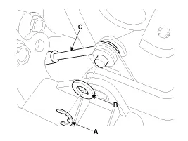 Desmonte el conjunto de la conexión del eje (C) después desmonte la tuerca E (A) y la arandela (B).