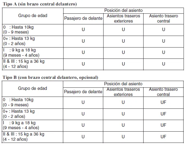 UF : Adecuado para sistemas "universales" de retención dirigidos hacia delante aprobados para su uso en este grupo.