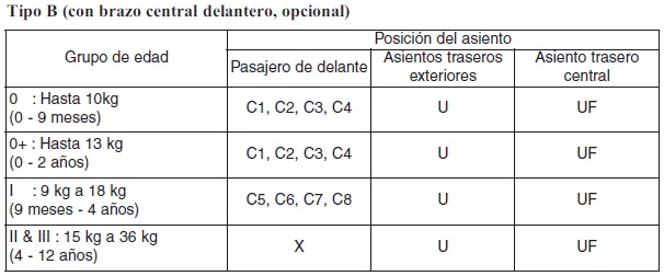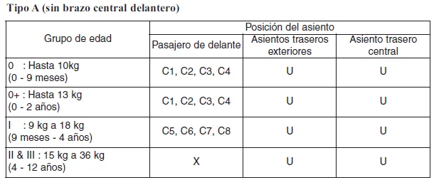 X : Posición del asiento no adecuada para niños de este grupo.