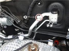 Conecte un sistema de Recuperación / Reciclado / Carga de refrigerante R-1234yf (A) al puerto de servicio de alta presión (B) como se indica, siguiendo las instrucciones del fabricante del equipo.