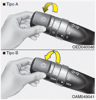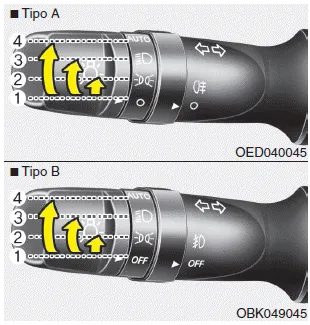 El mando de luces tiene una posición para el alumbrado de carretera y otra para las luces de posición. Para manejar las luces, gire el botón que hay en el extremo de la palanca de control a una de las posiciones siguientes: