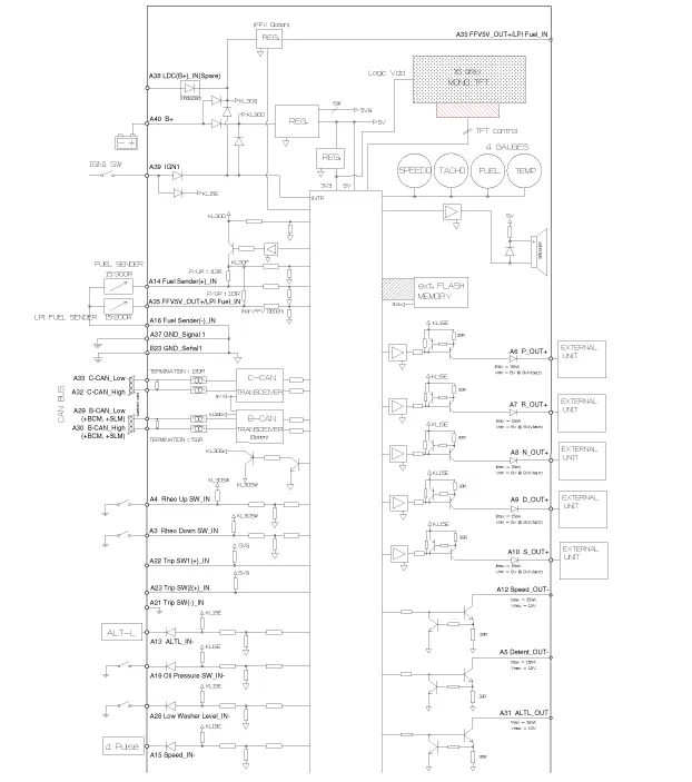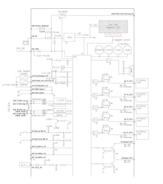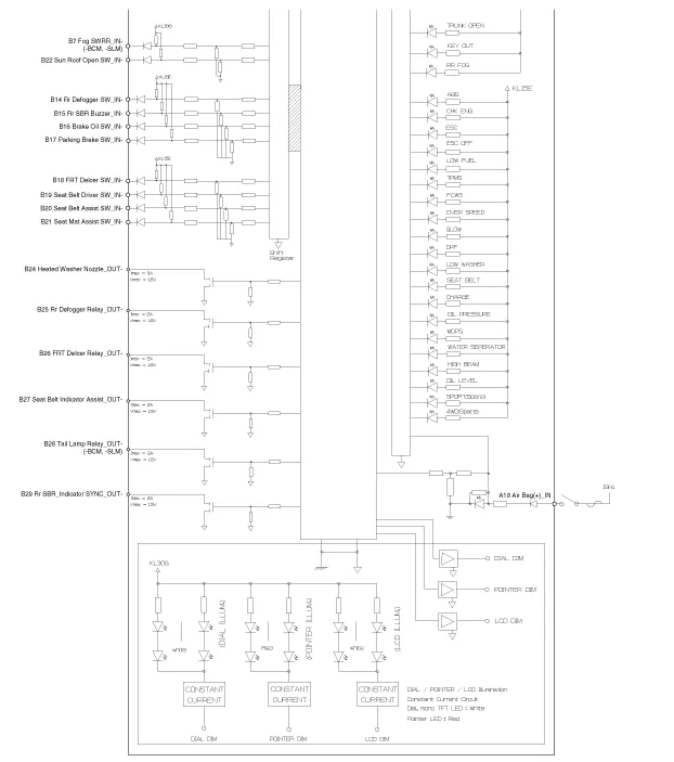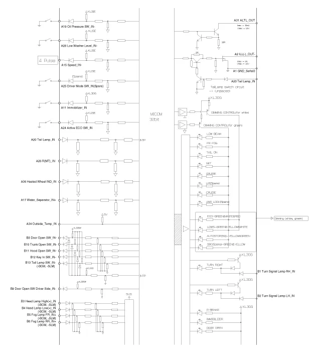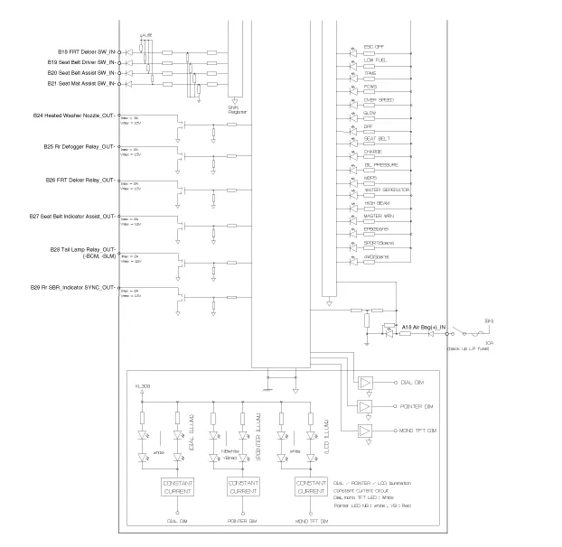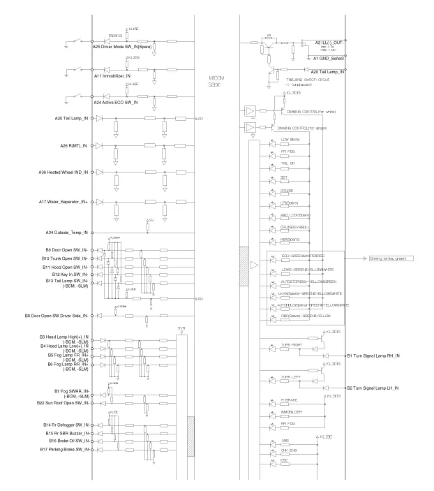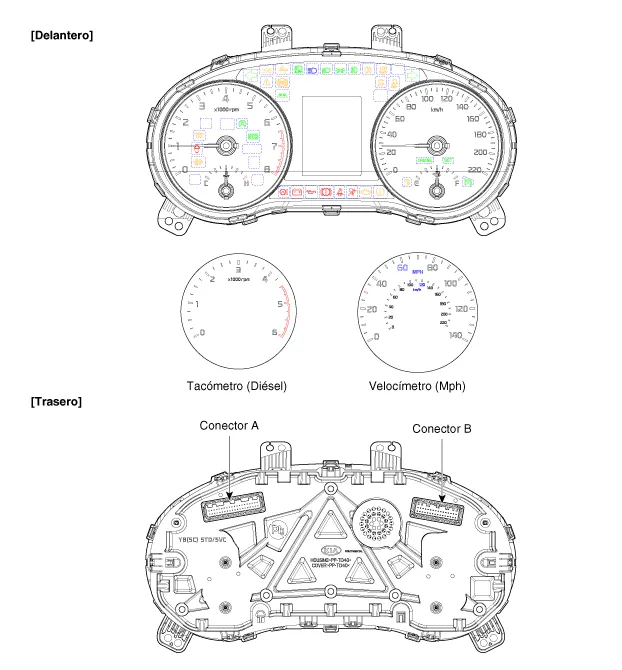 Diagnóstico de averías Diagnóstico de averías Elemento con error Síntoma de fallo Elementos de inspección Comprobaciones detalladas Piezas relevantes/ Componentes Visualización de la pantalla La pantalla LCD no se enciende 1) Acoplamientos del conector 2) Componentes 1) Compruebe los acoplamientos del conector 2) Compruebe el cableado de B+, ENC y MASA 3) Compruebe los componentes Conectores, cableado, fusibles, salpicadero Luz de advertencia Avería de la luz de aviso del airbag 1) Acoplamientos del conector 2) C_CAN 3) Componentes 1) Compruebe airbag + señal (conectores) 2) Compruebe la señal C-CAN (ACU4) 3) Compruebe el acople del FPC dentro del salpicadero Conectores ACU, cableado, fusibles, salpicadero Conversión de modo Avería del modo de conducción integrado 1) Acoplamientos del conector 2) INTERRUPTOR 3) Componentes 1) Compruebe la entrada del interruptor (conector) 2) Compruebe la entrada de la señal del interruptor (desconexión o cortocircuito) 3) Compruebe la conversión con el componente del salpicadero Conector del interruptor, cableado del salpicadero ILUMINACIÓN No se puede controlar el brillo de la luz interior.
