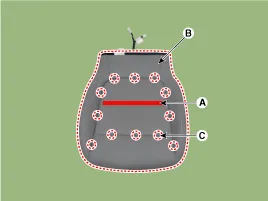 Extraiga la cubierta del cojín del asiento delantero (C) del bastidor del cojín del asiento delantero tras extraer la cinta de velcro (A) y las sujeciones de anillas (B).