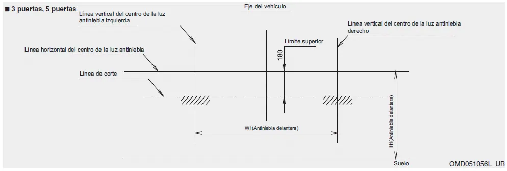 1. Encienda la luz de cruce sin el conductor en el interior. 2. La línea de corte debería proyectarse en la zona indicada en la línea de corte de la imagen.