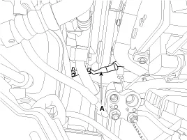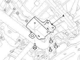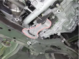 Desmonte los pernos del soporte de montaje de la transmisión (A).
